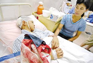 昨天下午,記者在吳川人民醫(yī)院了解到,19名受傷師生中,二年級的寧康權(quán)和四年級的寧康高,傷勢尤為嚴(yán)重,兩人的頭部分別被縫了1針和13針;其余受傷者中,多數(shù)人基本上都是手、腿等部位被割,傷勢較輕,沒有人有生命危險。(記者關(guān)家玉 通訊員林明聰 、王裕攝影報道)
