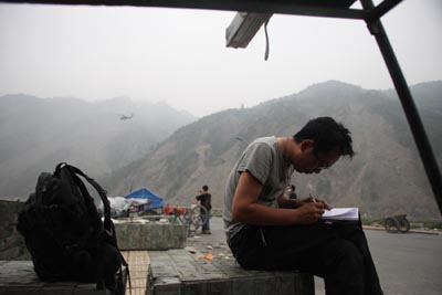 中新社記者宋方燦在重災(zāi)區(qū)映秀寫稿