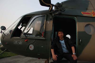 中新社攝影記者盛佳鵬等候直升飛機(jī)飛往災(zāi)區(qū)