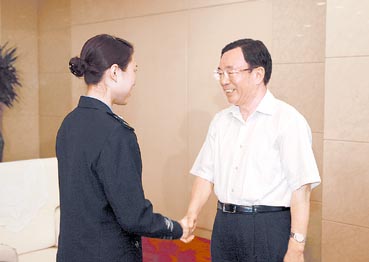 圖為賀國強(qiáng)與“抗震救災(zāi)優(yōu)秀紀(jì)檢監(jiān)察干部”蔣敏親切握手。(李玉龍 攝)