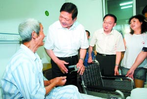 德陽市人民醫(yī)院收治了部分在地震中受傷的群眾。當(dāng)聽說許多傷者接受了截肢手術(shù),劉淇在行前特意囑咐工作人員,購買了100部輪椅贈(zèng)送給什邡人民。83歲的劉文友因受傷腿部截肢,劉淇俯下身把他攙到輪椅上,叮囑老人家好好休養(yǎng),爭取早日康復(fù)。北京市援建的什邡市社會(huì)福利中心建成兩周,已經(jīng)接收了近百名孤老,面對(duì)北京市領(lǐng)導(dǎo),吳定安老人泣不成聲,他的兩個(gè)兒子,都在地震中遇難。劉淇安慰老人,福利院就是你的家,北京人都是你的親人。