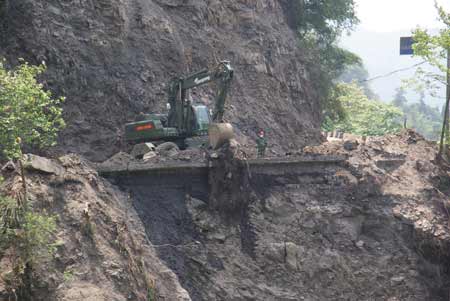 據(jù)悉,從6月4日始搶通了石門村至麻柳坪的道路后,鎣華鎮(zhèn)天寶村、瓦窯村、八角鎮(zhèn)雙橋村及八角鎮(zhèn)至彭州的山路共5條已全部打通,累計(jì)土石方10500余立方米。其中,鎣華鎮(zhèn)天寶村至五組的道路長(zhǎng)4.2公里,成空某機(jī)場(chǎng)工兵勤務(wù)隊(duì)采用人工配合機(jī)械的方式,輔以炸藥爆破,至6月18 日搶通該道路。6月24日,又完成馬祖到五組的路基處理工作。搶險(xiǎn)部隊(duì)表示,雖然如今道路已通,但由于余震不斷各路段仍有塌方,因此山路險(xiǎn)情仍不容忽視。