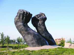 陳雙全任市長期間,銅川市內(nèi)的“雙拳”雕像。本報(bào)記者 楊繼斌 攝