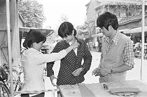 1985年6月,成都經(jīng)濟體制改革中第三產(chǎn)業(yè)發(fā)展很快,圖為街上的個體縫紉攤。