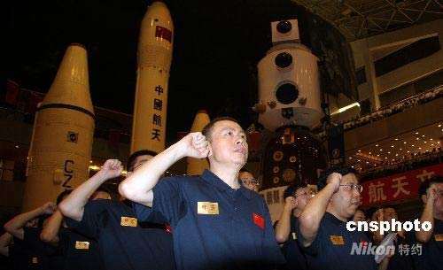 中國運(yùn)載火箭技術(shù)研究院二百多名“神箭”發(fā)射試驗(yàn)隊(duì)隊(duì)員列隊(duì)面向國旗宣誓,“長征二號F”運(yùn)載火箭總設(shè)計(jì)師荊木春代表發(fā)射試驗(yàn)隊(duì)表示,有信心、有決心確!吧衿摺边\(yùn)載火箭發(fā)射圓滿成功。隨后,發(fā)射試驗(yàn)隊(duì)隊(duì)員們都拿出寫好的“承諾卡”,依次上前粘貼于一塊專門的展板上,莊嚴(yán)承諾“確保成功,確保安全”。