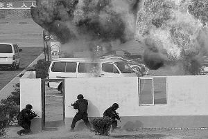 在指揮員下達攻擊令的余音聲中,突擊分隊兵分5路向目標發(fā)起攻擊:從地下鉆出的特戰(zhàn)隊員,對大廳兩名歹徒實施了無聲射殺,迅速排除了出入口爆炸物,為救援行動打開了通道?罩写菇档奶貞(zhàn)隊員從天窗潛入“歹徒”所在的樓層,乘坐攀登突擊車的兩組隊員左右破窗,與空中垂降的戰(zhàn)友同時攻入大廳,“歹徒”未及反抗,就被一一擊斃或制服。樓頂?shù)奶貞?zhàn)隊員在對防護窗實施精確爆破后,利用繩索從天而降,破窗而入,身體騰空中,舉槍擊發(fā),“歹徒”未及反應,就已中彈斃命,人質(zhì)被安全解救。