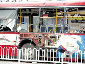 記者看到,公共汽車車體的一側(cè),在駕駛員后的位置,爆炸造成一個(gè)1.5米左右的裂口,部分座位變形,車體后部則完好無損,但車窗玻璃已全部爆碎,車體車窗玻璃及膠條最遠(yuǎn)的飛出了10多米,附近全是玻璃碎片,數(shù)十名警察拉起了警戒線。
