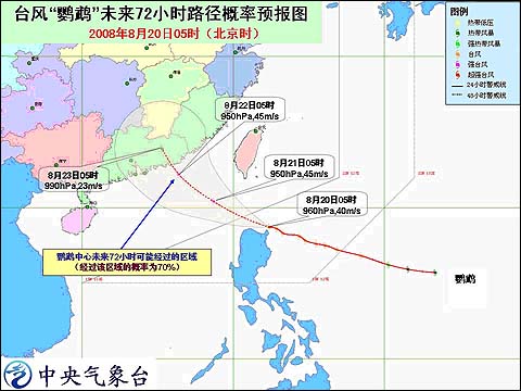 受其影響,今天白天到夜間,巴士海峽、巴林塘海峽、臺灣省南部沿海、臺灣東南部海面、南海東北部海面將有到7-10級大風,“鸚鵡”中心經過的附近海面風力可達11-14級;臺灣南部的部分地區(qū)將有大到暴雨。