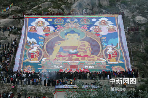 雪頓節(jié)最早是一種宗教活動(dòng),是老百姓以酸奶對(duì)寺院行長凈、夏安居之事后解禁僧人的敬奉。十七世紀(jì)下半葉,雪頓節(jié)逐漸演變和固定成以藏戲匯演和展佛為主、文娛與宗教相結(jié)合的重要節(jié)日,所以又被稱為“藏戲節(jié)”、“展佛節(jié)”。自去年起。該節(jié)升格為“中國拉薩雪頓節(jié)”,成為國家級(jí)旅游、文化、經(jīng)貿(mào)節(jié)慶。今晨有上萬游客及信眾在現(xiàn)場參觀了哲蚌寺展佛。