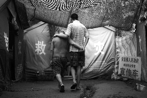 劉軍是北川縣曲山鎮(zhèn)人,地震奪去了他妻子的生命,家財(cái)盡毀。現(xiàn)在劉軍已出院,在北川擂鼓鎮(zhèn)的災(zāi)民安置點(diǎn)四處游蕩。周圍的災(zāi)民說(shuō),他時(shí)常沉默不語(yǔ),四處扒土。