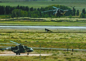 昨日,直升機(jī)起飛參加“神七”主著陸場(chǎng)搜救演習(xí)。 郭超 攝