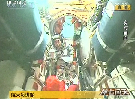 中新網(wǎng)9月25日電 25日18時(shí)25分許,神舟七號(hào)三名航天員陸續(xù)進(jìn)艙。第一名進(jìn)艙的是景海鵬,第二名進(jìn)艙的是劉伯明,最后,指令長(zhǎng)翟志剛也開(kāi)始進(jìn)入。