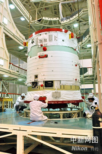 中國神舟七號(hào)載人航天飛船發(fā)射在即。飛船推進(jìn)艙起吊(資料圖片)。