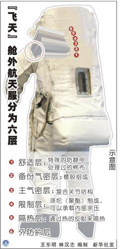 中國的艙外航天服通體純白,從上到下依次是頭盔、上肢、軀干、下肢、壓力手套、靴子。從內到外,則分為6層:由特殊防靜電處理過的棉布織成的舒適層、橡膠質地的備份氣密層、復合關節(jié)結構組成的主氣密層、滌綸面料的限制層、通過熱反射來實現(xiàn)隔熱的隔熱層、最外面的外防護層。服裝的四肢裝有調節(jié)帶,通過調節(jié)上臂、小臂和下肢的長度,身高1.60米—1.80米的人都能穿上這套衣服。