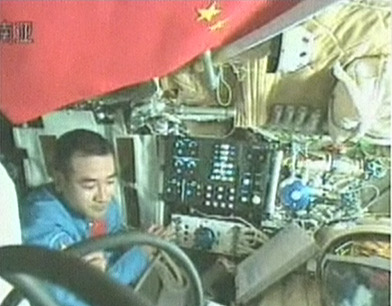 據(jù)報(bào)道,在神七傳回的艙內(nèi)畫面顯示,軌道艙內(nèi)航天員正在組裝航天服,艙內(nèi)有一面紅色的旗幟,經(jīng)確認(rèn)過這是一面五星紅旗。