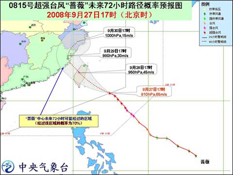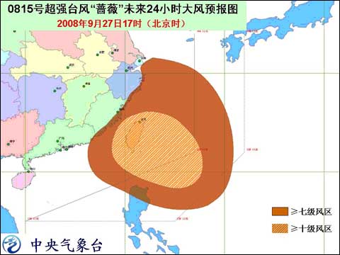 中新網(wǎng)9月27日電 據(jù)中國(guó)天氣網(wǎng)消息,中央氣象臺(tái)2008年9月27日18時(shí)發(fā)布臺(tái)風(fēng)紅色警報(bào)稱:預(yù)計(jì),今年第15號(hào)超強(qiáng)臺(tái)風(fēng)“薔薇”將以每小時(shí)20-25公里的速度向西北方向移動(dòng),逐漸向臺(tái)灣東部一帶沿?拷瑢⒂诿魈熘形绲揭归g在臺(tái)灣宜蘭到臺(tái)東一帶沿海登陸。