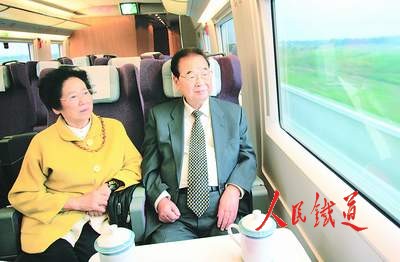 隨后,李鵬走進駕駛室,興致勃勃地察看了動車組列車控制系統(tǒng)和動車組司機的操縱情況。劉志軍向李鵬介紹:我們乘坐的列車是靠計算機控制的。中央指揮系統(tǒng)把指令傳輸?shù)杰壍郎系南嚓P(guān)設備,列車從軌道上的設備取得信號,實施行車、加速、減速、制動等技術(shù)動作。這一系統(tǒng)是目前世界上最先進的。李鵬又了解了京津城際鐵路占地情況,詢問如何解決與公路交叉等問題。劉志軍匯報說,京津城際鐵路87%是橋梁,每公里橋梁與傳統(tǒng)的路基相比可以節(jié)省45畝土地,同時高架的橋梁也杜絕了與公路的平面交叉,有利于保證安全。劉志軍說,目前在建的京滬高速鐵路和一大批客運專線都借鑒了京津城際鐵路的成功經(jīng)驗,以橋代路的模式被廣泛應用。李鵬稱贊京津城際鐵路創(chuàng)造了世界高速鐵路的最新成果。他關(guān)切地詢問,像京津城際這樣的高速鐵路,現(xiàn)在建設的有多少?劉志軍說,目前在建的高速鐵路和客運專線有7000公里,再過3至5年,京滬、京廣、京哈、隴海(東段)、哈大、東南沿海等客運專線將全線貫通。李鵬聽了非常高興。他說,近年來,鐵路建設和技術(shù)裝備現(xiàn)代化的發(fā)展很快,老百姓享受到了鐵路改革發(fā)展的成果。他希望鐵路部門高標準、高質(zhì)量地建好京滬高速鐵路和其他客運專線,為旅客提供更加便利、快捷的出行條件。