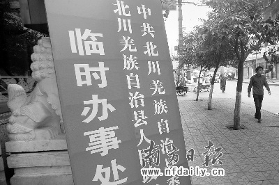 由于北川新縣城選址一直待定,北川縣委、縣政府的駐地在災(zāi)后數(shù)易其址。從最初北川中學(xué)附近的帳篷,遷至北川擂鼓鎮(zhèn)的帳篷。期間,還曾在安昌鎮(zhèn)天龍賓館的大堂設(shè)立臨時辦事處?h里的各委、辦、局則擠在旁邊的一間火鍋店里,甚至“三個單位合用一個桌子”。后來化整為零?h級61個單位分散租用安昌鎮(zhèn)的民房作為辦公地兼集體宿舍。