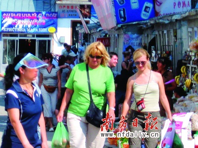 眼下,俄羅斯游客來撫遠即時享受者居多。俄方規(guī)定每個俄國人回境不能帶超過35公斤的物品,為此,他們在撫遠盡情即時享受中國菜、中國酒,回境時盡量把買的衣服套滿全身。
