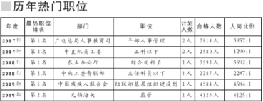 據(jù)初步統(tǒng)計,2009年公務(wù)員考試的報名人數(shù)已經(jīng)超過2008年的80萬大關(guān)。同時,最熱門職位的競爭率也是三年來首次超過4000:1,中國殘疾人聯(lián)合會組聯(lián)部基層組織建設(shè)一職已經(jīng)有4584人爭報。較之2008年最高供需比3592:1“更上一層樓”。
