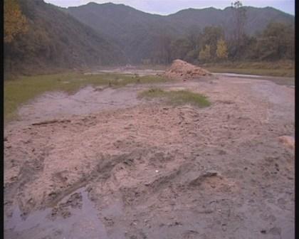 解說(shuō):記者來(lái)到現(xiàn)場(chǎng),果然看到一片因尾礦庫(kù)泄露的莊稼地.。上面覆蓋著厚厚的礦渣.就在記者正在拍攝時(shí),巨恒公司二廠的人員趕來(lái),阻止了記者的繼續(xù)拍攝。見(jiàn)此情況記者離開(kāi)了巨恒公司二廠。沿河道向上繼續(xù)了解情況。