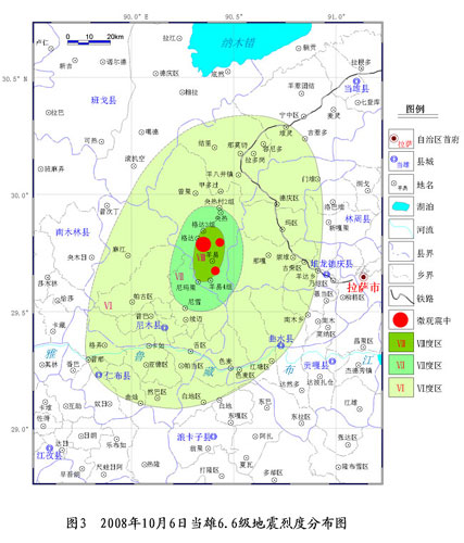 2008年10月6日16時(shí)30分(北京時(shí)間),西藏自治區(qū)拉薩市當(dāng)雄縣(北緯29.8°,東經(jīng)90.4°)發(fā)生Ms6.6級(jí)地震。地震發(fā)生后,由中國(guó)地震局、西藏自治區(qū)地震局和云南省地震局及西藏自治區(qū)相關(guān)單位組成的聯(lián)合地震現(xiàn)場(chǎng)工作隊(duì)在震區(qū)開(kāi)展了為期7天的地震災(zāi)害調(diào)查和損失評(píng)估工作,共計(jì)行程20000多公里,完成60個(gè)居民點(diǎn)和3個(gè)地震地質(zhì)災(zāi)害點(diǎn)的調(diào)查工作,其中抽樣調(diào)查點(diǎn)41個(gè)。在震區(qū)各級(jí)黨委、政府的協(xié)同配合下完成了地震災(zāi)害損失評(píng)估工作。