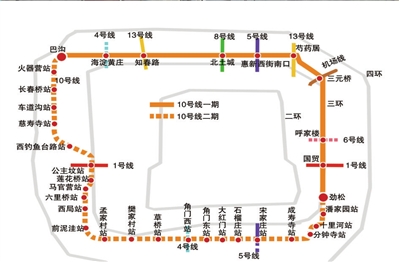 將于下月底動工的10號線二期全長32.46公里,起點為勁松站,終點為巴溝站,全長設(shè)站23座,其中換乘站12座,預(yù)計2013年9月30日竣工。屆時它將與已通車的10號線一期組成北京第二條環(huán)線地鐵線路。
