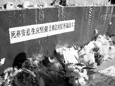 “死亦安息生應(yīng)堅(jiān)強(qiáng)讓我們共同祈福法大”。10月31日中午,中國(guó)政法大學(xué)昌平校區(qū)拓荒牛雕塑的基座上,一條白底黑字的條幅在陽(yáng)光下冷冷地注視著過(guò)往的每一個(gè)人。雕塑前的地面上,幾排黃色的、白色的菊花在秋風(fēng)中靜靜綻放。