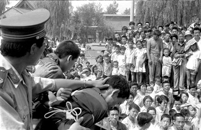 同時,留在人們集體記憶中的,還有公判大會。劉仁文說,當時被押到現場的犯罪分子,戴著畫了大紅叉的木牌,垂頭喪氣,聽候著聲勢浩大的審判。臺下,上萬名群眾都在圍觀,人們竊竊私語,“這不是誰誰家的兒子嗎?聽說搶了幾千塊錢,被判死刑了!