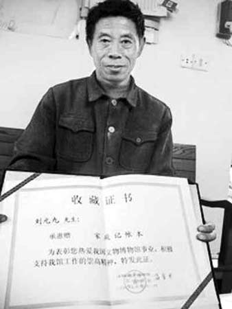 劉元九展示國家博物館頒發(fā)給他的收藏證書。