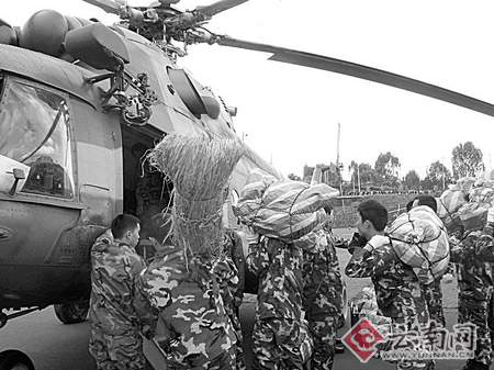由于受災(zāi)較嚴重的地區(qū)均屬于偏遠高寒山區(qū),通往災(zāi)區(qū)的道路全部中斷,短期之內(nèi)無法搶通,為及時將災(zāi)區(qū)急需的大量救援物資送達災(zāi)區(qū),楚雄彝族自治州請求省人民政府給予協(xié)調(diào)直升飛機支援災(zāi)區(qū)救援。省人民政府接到請求后,協(xié)調(diào)由成都軍區(qū)的3架直升機參加支援楚雄州重災(zāi)區(qū)應(yīng)急救災(zāi)工作。