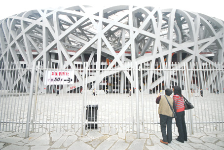 11月4日,國(guó)家體育場(chǎng)———鳥(niǎo)巢參觀票售票廳前,四位老人悻悻而歸。