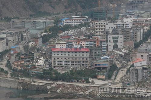山谷中,青山綠水間的北川縣城盡收眼底,藍(lán)色、橙色、紅色的屋頂錯落有致;湔江上,連接新老縣城的吊橋清晰可見;老縣城里,北川電力公司藍(lán)紫色的框架格外惹眼;新縣城里,毛壩中學(xué)操場上的國旗迎風(fēng)飄揚。站在這里,可以看到菜市里熙熙攘攘的人群;可以看到三輪車夫在路上攬客……地震發(fā)生后,難以計數(shù)的巨石將三倒拐壓得嚴(yán)嚴(yán)實實,所有的樓房無一例外遭到巨大破壞。