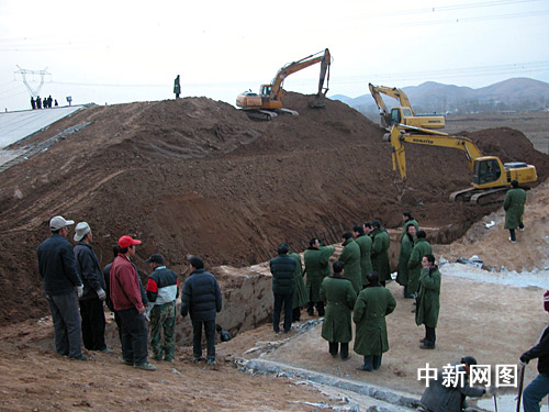 記者23日下午在現(xiàn)場(chǎng)看到,發(fā)生跑水的渠段已被從南北兩側(cè)攔截,有五六輛挖掘機(jī)正在作業(yè),干渠被截開(kāi)近一丈寬的口子,渠底一條橫貫東西的水泥槽已明顯裸露出來(lái)。十幾個(gè)穿綠大衣的人站在截開(kāi)的渠北側(cè),許多施工人員聚攏周?chē)?/p>