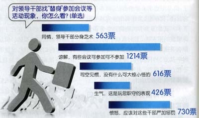 “你認為領(lǐng)導(dǎo)干部找‘替身’開會對工作是否有影響?”問卷調(diào)查結(jié)果顯示,46.56%的受調(diào)查者認為“有影響,規(guī)定‘一把手’參加的會議自有其道理”,24.34%的受調(diào)查者認為“很難說,要看具體情況而定”,29.1%的受調(diào)查者認為“沒有影響,只要將會議的主要精神傳達到了就可以”。