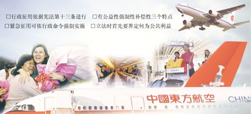 記者在采訪中了解到,我國(guó)目前沒(méi)有對(duì)行政征用進(jìn)行專門的立法,行政征用除了有憲法的依據(jù)外,還散見于其他法律法規(guī)之中,如涉及消防、抗洪、抗震等。但針對(duì)征用機(jī)場(chǎng)、客機(jī)的具體規(guī)定,還是空白。