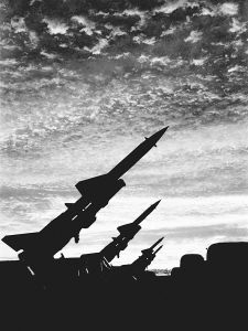 突然,霹靂震天,地平線(xiàn)上猛地躥起一條條“火龍”,拖著銀白的煙柱直刺蒼穹。轉(zhuǎn)眼,“火龍”變作一顆顆熾熱的流星,怒吼著、呼嘯著,把一架架行蹤詭秘的“敵”機(jī)打得粉身碎骨……