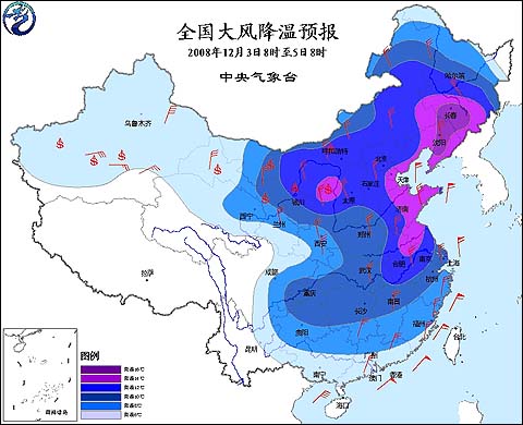 2008年12月3日08時(shí)全國大風(fēng)降溫預(yù)報(bào)圖