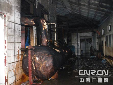 火災過后,車間內一片狼籍,部分氨氣管道外已結冰,在車間,技術人員經過檢查,發(fā)現的連接氨氣的電機制冷機一個蓋子“爆了”,技術人員稱爆炸就是從這里產生的。