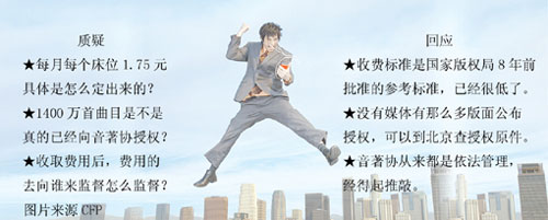 音著協(xié)云南辦事處負(fù)責(zé)人張晏琿針鋒相對(duì)地表示,“收費(fèi)不是目的,保護(hù)知識(shí)產(chǎn)權(quán)才是目的,有‘抱團(tuán)’抵制現(xiàn)象也是對(duì)知識(shí)產(chǎn)權(quán)有進(jìn)一步認(rèn)識(shí)的表現(xiàn)。雖然尊重其選擇,但是這種行為并非理性明智之舉”。