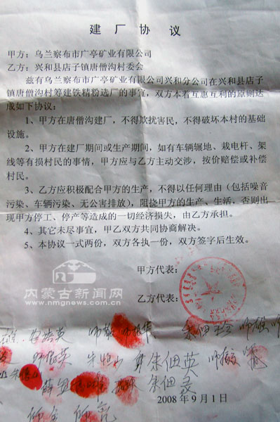 興和縣店子鎮(zhèn)蘆葦溝行政村村主任師振高與烏蘭察布市廣亭公司簽了一份協(xié)議,內(nèi)容大意是這個(gè)公司可以在當(dāng)?shù)夭设F礦,但要保證當(dāng)?shù)鼐用癜踩!這份看似毫無意義的協(xié)議卻在當(dāng)?shù)厥钟行В迕穸颊J(rèn)為這是合法的采礦企業(yè),而企業(yè)也變得更加大膽,并在村主任的協(xié)調(diào)下與村民以兩千元一畝的價(jià)格購下了唐僧溝村舊村址,說要建成一個(gè)大中型的鐵礦石浮選廠。