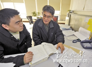 安順基(右)向同事學(xué)習(xí)漢語(yǔ) 記者 冉文 攝