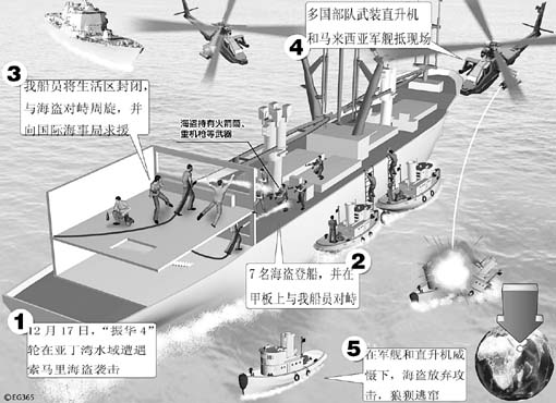 中國(guó)貨輪“振華4”輪12月17日在索馬里沿海亞丁灣水域遭海盜襲擊,但船員及時(shí)啟動(dòng)應(yīng)急預(yù)案,采取防范措施,等待多國(guó)部隊(duì)海軍艦只援救,最終成功脫險(xiǎn)。