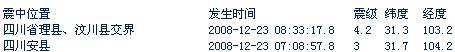 據(jù)地震臺網(wǎng)測定,北京時間2008-12-23 08:33:17.8 在四川省理縣、汶川縣交界(北緯31.3,東經(jīng)103.2) 發(fā)生4.2級地震。成都市區(qū)震感明顯。