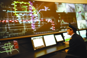 昨日,工作人員在指揮大廳監(jiān)控地鐵。本報記者 浦峰 攝