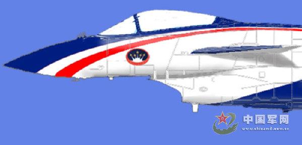 殲-10表演隊的隊徽采用兩個鑲嵌的橢圓,中間是6架戰(zhàn)鷹,在兩個橢圓之間下部噴涂“空軍八一飛行表演隊”字樣。 隊徽顏色采用紅、黃、藍、白四種顏色。噴涂在機頭左右兩側(cè),共2處(見圖12、13)。