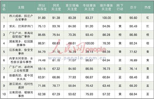 說明:表中總分依據(jù)網(wǎng)民關(guān)注度、傳統(tǒng)媒體報(bào)道、網(wǎng)站推薦度、意見領(lǐng)袖關(guān)注度、境外媒體關(guān)注度、網(wǎng)下行動(dòng)六項(xiàng)數(shù)據(jù)作加權(quán)處理后統(tǒng)計(jì)所得。各項(xiàng)權(quán)重分別為:網(wǎng)民關(guān)注30%、傳統(tǒng)媒體報(bào)道15%、網(wǎng)站推薦度10%、意見領(lǐng)袖關(guān)注度20%、境外媒體關(guān)注度10%、網(wǎng)下行動(dòng)15%。依據(jù)總分將輿情熱度劃分為紅、橙、黃、藍(lán)四個(gè)級(jí)別,熱度相應(yīng)由高至低。其中90.00分以上輿情熱度為紅色,事件最受輿論關(guān)注,80.00—89.99分輿情熱度為橙色,70.00—79.99分輿情熱度為黃色,70.00分以下輿情熱度為藍(lán)色,事件關(guān)注度相對(duì)最低。