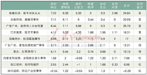 人民網(wǎng)輿情監(jiān)測(cè)室從100多家境內(nèi)外報(bào)刊的新聞報(bào)道和評(píng)論,8家門戶網(wǎng)站的新聞跟帖,約30家論壇/BBS,400余名網(wǎng)絡(luò)“意見領(lǐng)袖”博客,以及微博客、QQ群和播客網(wǎng)站中,梳理出了2009年第四季度十件“輿情熱點(diǎn)事件”,并按照“政府響應(yīng)、信息透明度、政府公信力”3個(gè)常規(guī)指標(biāo),以及“恢復(fù)秩序、動(dòng)態(tài)反應(yīng)、官員問責(zé)”3個(gè)特殊指標(biāo),對(duì)2009年第四季度十件“輿情熱點(diǎn)事件”的政府應(yīng)對(duì)、處置能力做出了評(píng)估,結(jié)論是: