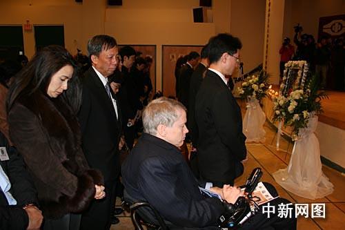 追思會(huì)中午十二時(shí)許在華埠“禮和堂”舉行,臺(tái)上兩側(cè)掛著名家書(shū)寫(xiě)的對(duì)聯(lián):“一代巨星歡樂(lè)長(zhǎng)存熒幕上,千秋典范笑顏永在人心中”。舞臺(tái)下正中擺設(shè)肥姐遺照,兩旁放置著白玫瑰白百合花圈。