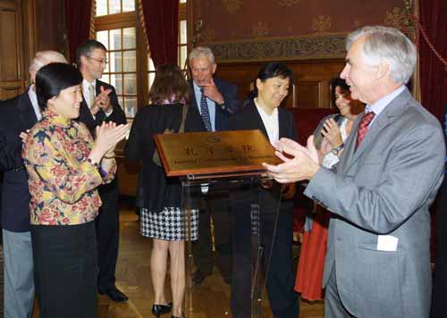 為了表現(xiàn)該城對建立孔子學院的重視,掛牌儀式特別移到拉羅舍爾德市政府大廳舉行。市政廳也是一處歷史古跡,火焰哥特式圍墻包圍著文藝復興風格的建筑主體。特別顯眼的是市政府特意在大門口的歐盟旗和法國國旗旁邊掛上了鮮艷的五星紅旗。為了讓儀式隆重熱烈,除了普瓦圖-夏朗德大區(qū)議會與拉羅舍爾市地一干政要及嘉賓外,市長馬科斯穆•布諾特別邀請了社會各界人士以及當?shù)氐娜A僑華人和留學生等約200人出席當天的活動,把個節(jié)日大廳擠得滿滿的。